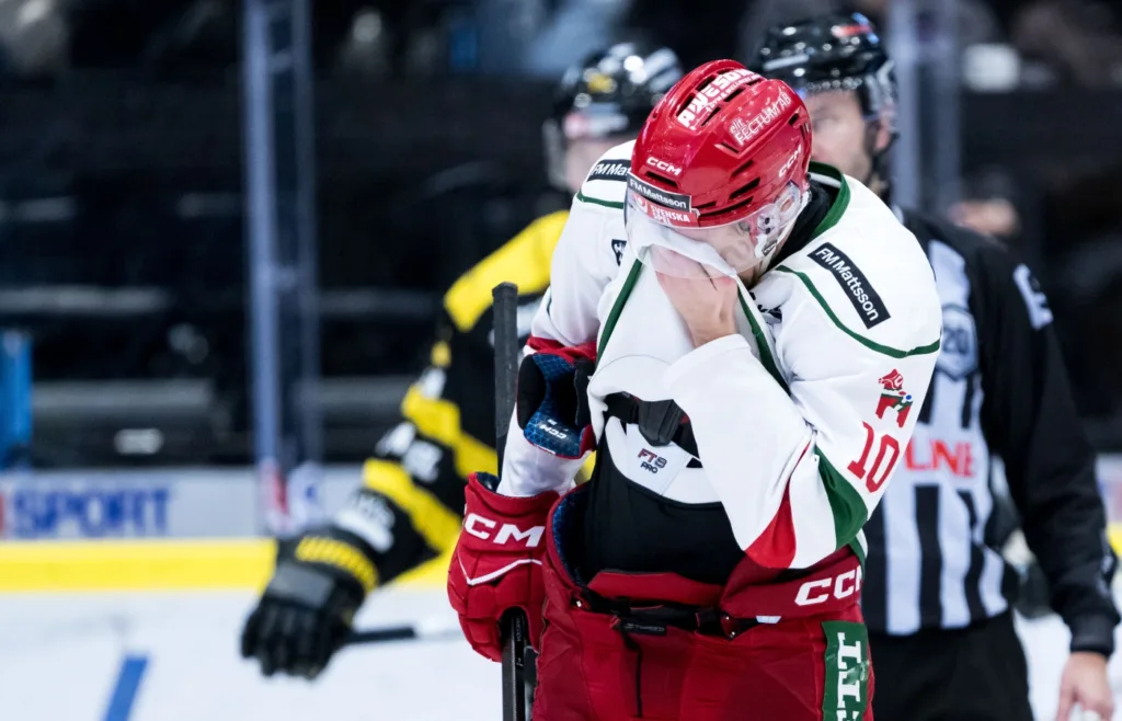 Karl Smedberg deppar under ishockeymatchen i Hockeyallsvenskan mellan Västerås och Mora den 24 oktober 2025 i Västerås.