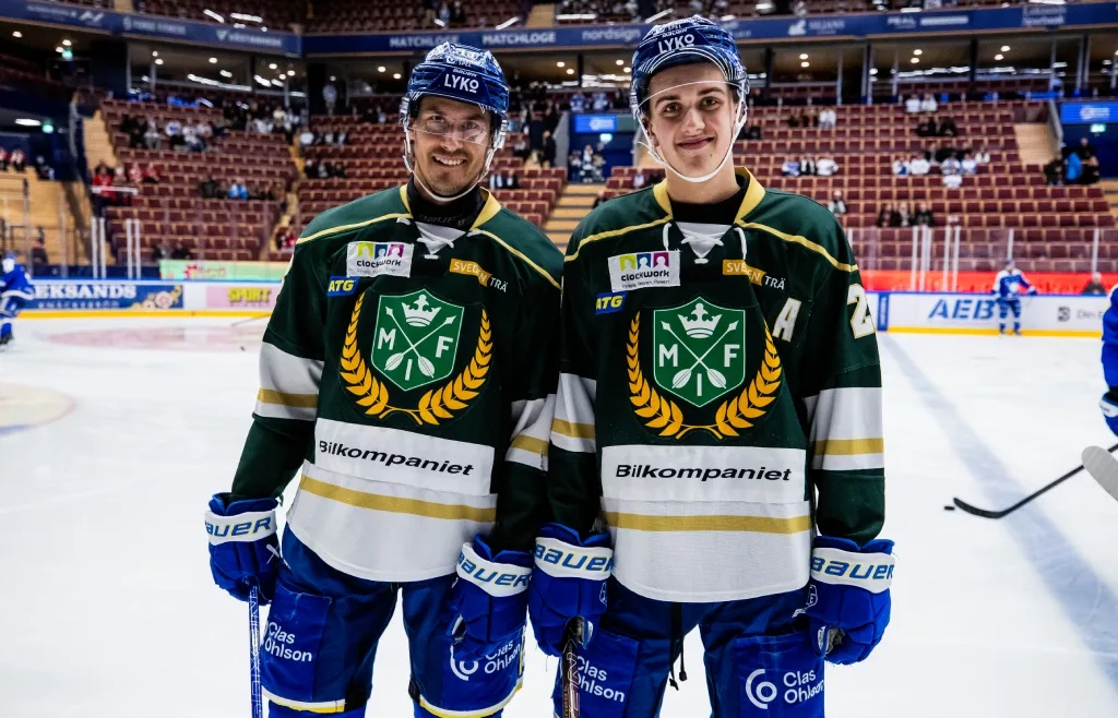 Leksands Jon Knuts och August Lissel i Malungs tröjor inför ishockeymatchen i SHL mellan Leksand och Modo den 26 november 2024 i Leksand.