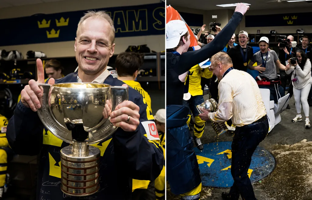 – Ja, jag var tvungen att byta bort kavaj och skjorta här. Grabbarna påminde mig om att jag måste ha salt. Det var X-antal liter sportdryck, säger han till hockeysverige.se efter att JVM-guldet säkrats.