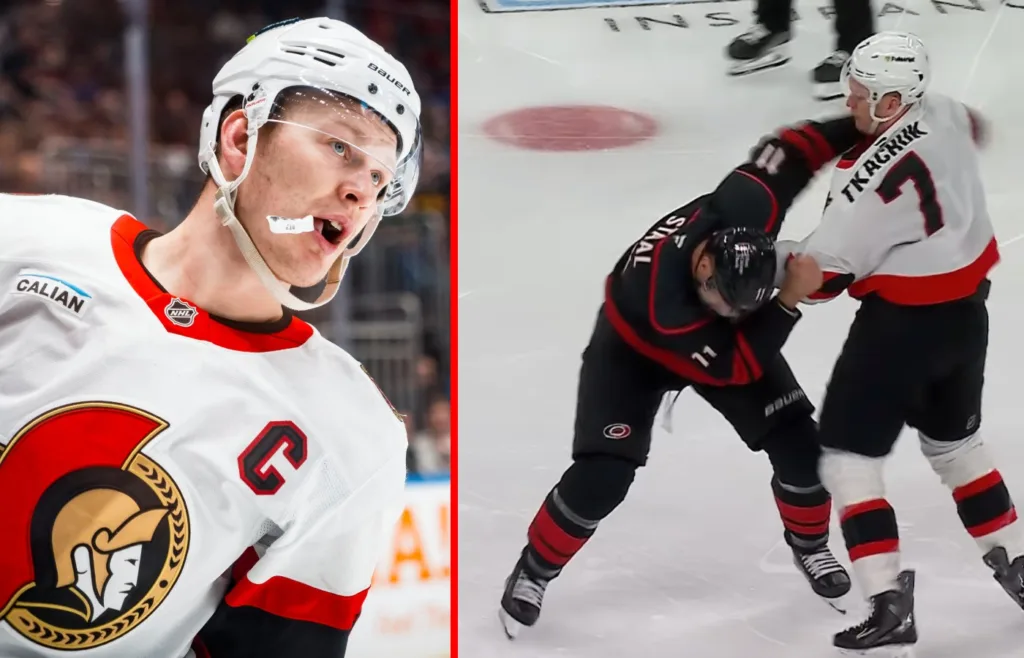 Stanley Cup-slutspelet 2026 invigdes på lördagskvällen med första mötet mellan Carolina Hurricanes och Ottawa Senators. Pucken hann inte mer än att släppas i Lenovo Center i Raleigh innan det första slagsmålet utbröt – och det mellan lagkaptenerna Jordan Staal och Brady Tkachuk.