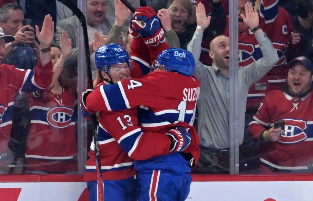 Cole Caufield firar säsongens 50:e mål tillsammans med Nick Suzuki. Foto: Eric Bolte-Imagn Images