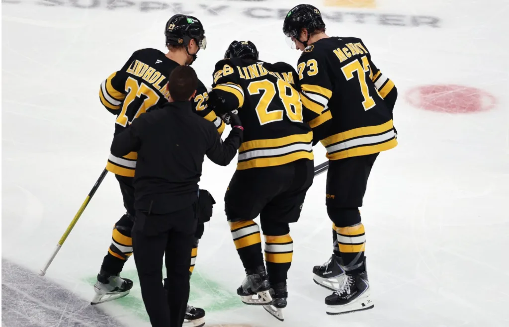 Elias Lindholm fick hjälpas av isen i natt. Nu kommer beskedet att Boston Bruins svenske center kommer att bli borta ett tag efter att ha ådragit sig en underkroppsskada.