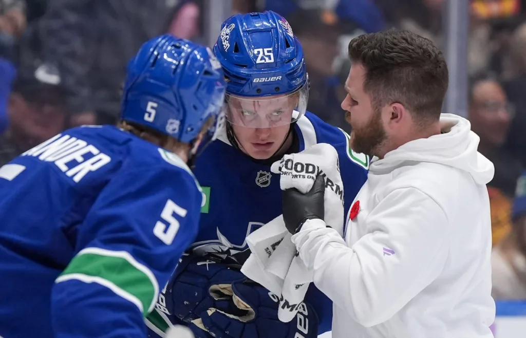 Elias Pettersson hade precis spelat ifrån sig pucken bakom eget mål när Mathieu Olivier fullföljde en tackling. Han träffade svensken rakt bakifrån och Petterssons ansikte åtke in i plexiglaset. Han föll till isen i plågor och fick assisteras av isen. 21-åringen spelade sedan inte mer i matchen.