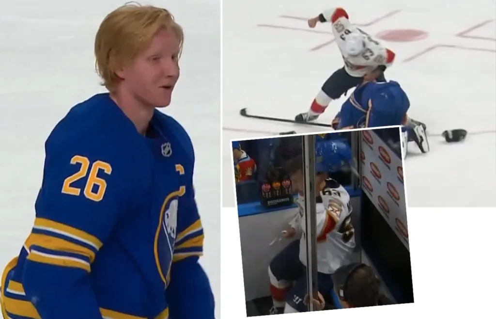 Brad Marchand tappade det totalt på Rasmus Dahlin i lördagskvällens NHL-möte mellan Florida och Buffalo. 37-åringen hoppade på svensken efter en tackling och satt senare och slet sönder Dahlins hjälm till utvisningsbåset.