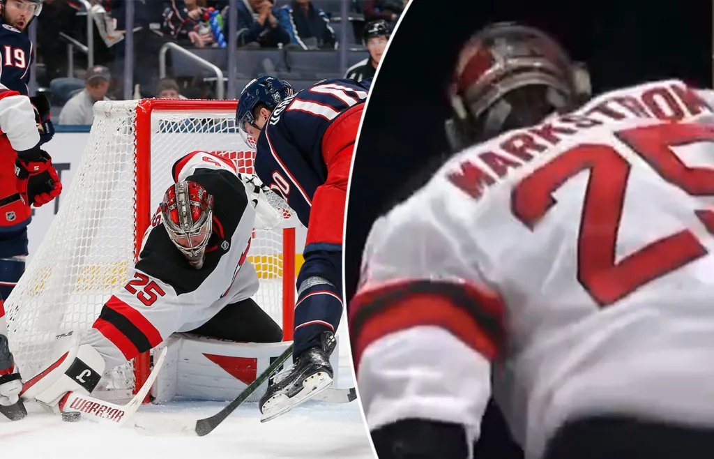 Åtta av nio puckar räddades av Jacob Markström när han hoppade in sent i nattens 3–2-seger mot Columbus Blue Jackets. Vid den nionde såg New Jersey Devils svensk ut att få ont. Efter slutsignal haltade 35-årige VM-målvakten av isen.