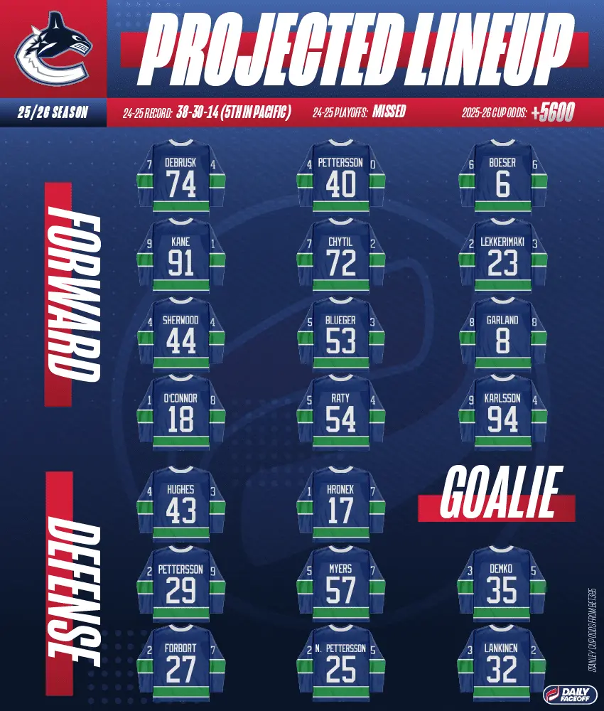 Canucks är ett förbryllande gäng. Det finns inget lag som har visat sig vara mer beroende av en enskild spelare, även om Marcus Pettersson skulle kunna ta lite pressen från Hughes 2025/26. Det kanske inte finns någon annan trupp med så många osäkerhetsfaktorer heller. Alla Elias Pettersson, Lekkerimäki, Chytil och till och med Demko har en frustrerande bred uppsättning möjliga utfall.