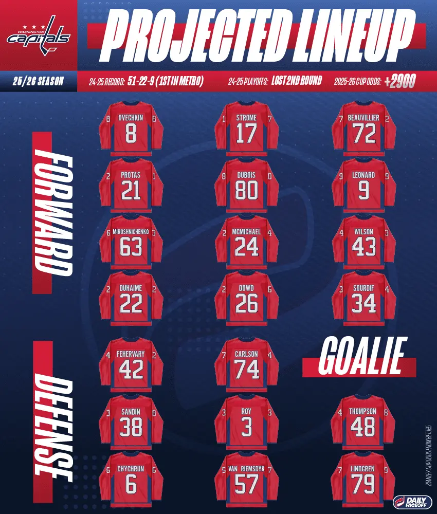 Inför säsongen 2025/26 gjorde Capitals inga större förändringar. Några spelare lämnade för att ge plats åt nya kontraktsförlängningar, och luckorna fylldes med rollspelare. Frågan är om Washington kan upprätthålla fjolårets nivå eller om laget tar ett steg tillbaka i vad som kan bli Ovetjkins sista säsong.