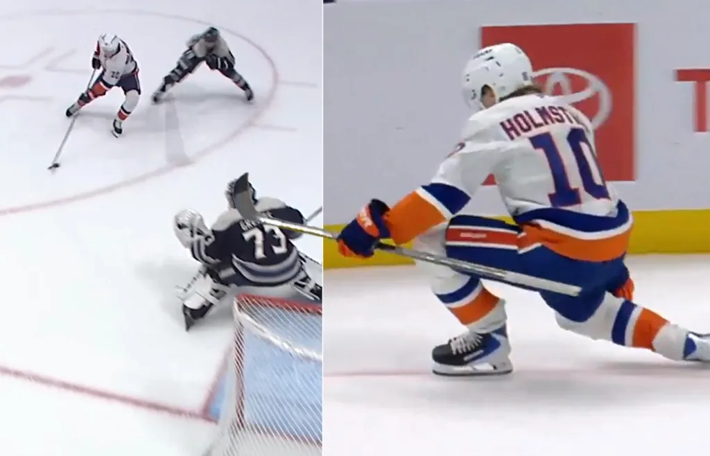24-åringen, fostrad i Tranås och HV71, klev nämligen fram som stort hjälte när förlängning väntade mellan Columbus Blue Jackets och hans New York Islanders. Klockade visade 1.47 och stora delar av arenan stod säkerligen redan upp då Holmström skrinnat sig till läget på egen hand. Jet Greaves i målet rundades enkelt och svensken fick jubla.