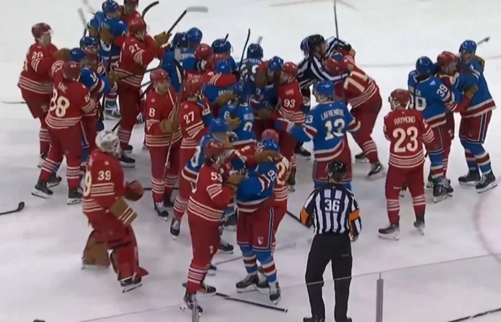 Nattens klassikermöte mellan New York Rangers och Detroit Red Wings slutade i ett jättebråk.