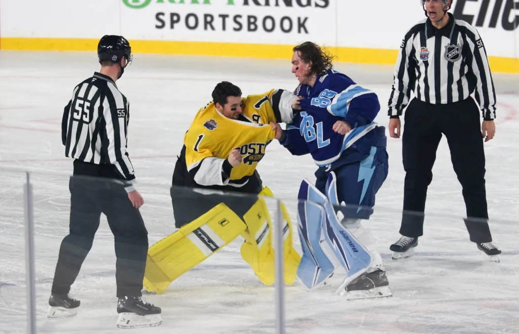 I den andra perioden, vid ställningen 5-2 till Boston, möttes målvakterna vid mitten av isen. De kastade handskarna och hamnade sedan i ett handgemäng.