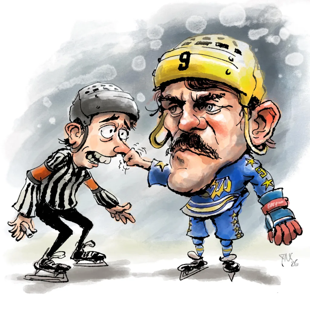 November 1976 och HV71 har bortamatch mot Tyringe som just vänt matchen från 2-0 till 2-3. Domaren Benkt Gunbro från Halmstad tröttnade på Janne Bergstrands tjat och gav honom matchstraff.