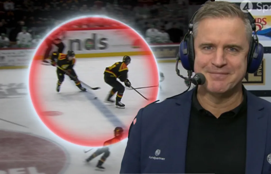 – En millimeter, det är svårt ändå för domarna. Samtidigt står linjedomaren precis där, men jag undrar om Trivigno skymmer pucken lite för honom, svarar Johansson igen.