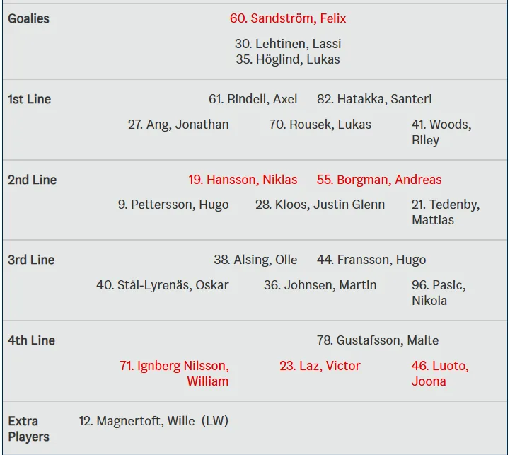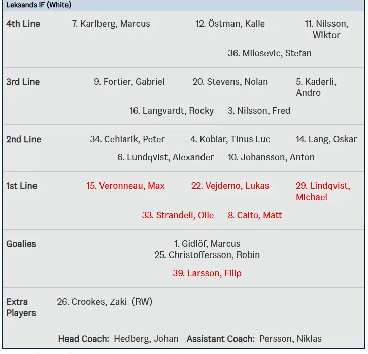 Om vi börjar med bortalaget Leksand saknar de Joonas Lyytinen och Stefan Milosevic på backsidan. 07:an Rocky Langvardt kliver in i tredje backpar med Fred Nilsson och Leksand kommer till spel med endast sex backar.