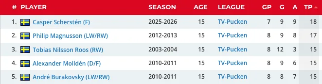 Ingen spelare i TV-pucken har gjort fler poäng för Skåne under en turnering än Casper Scherstén. Under slutspelshelgen har 15-åringen passerat bland annat André Burakovsky.